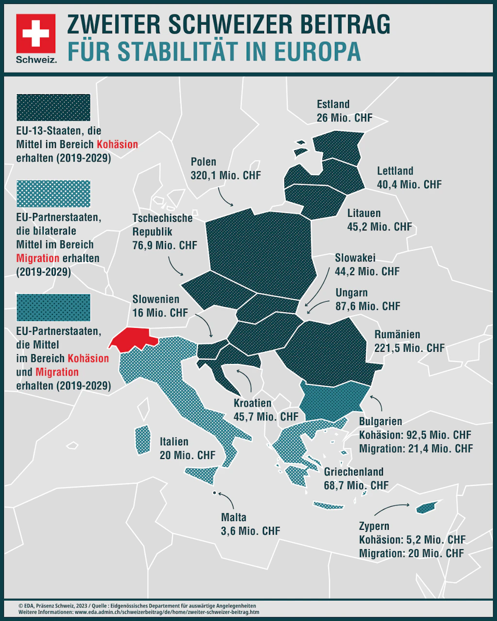 Der zweite Schweizer Beitrag sieht eine Investition von 1,302 Milliarden Franken über eine Laufzeit von zehn Jahren bis Ende 2029 vor. Dies entspricht dem gleichen Betrag wie beim Erweiterungsbeitrag. Mit dem Beitrag werden die Staaten unterstützt, die der EU seit 2004 beigetreten sind (Bulgarien, Estland, Kroatien, Litauen, Lettland, Malta, Polen, Rumänien, Slowakei, Slowenien, Tschechische Republik, Ungarn und Zypern). Für diese hat die Schweiz insgesamt 1,102 Milliarden Franken vorgesehen.